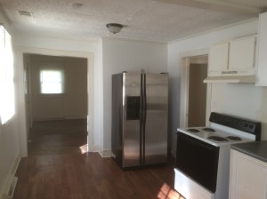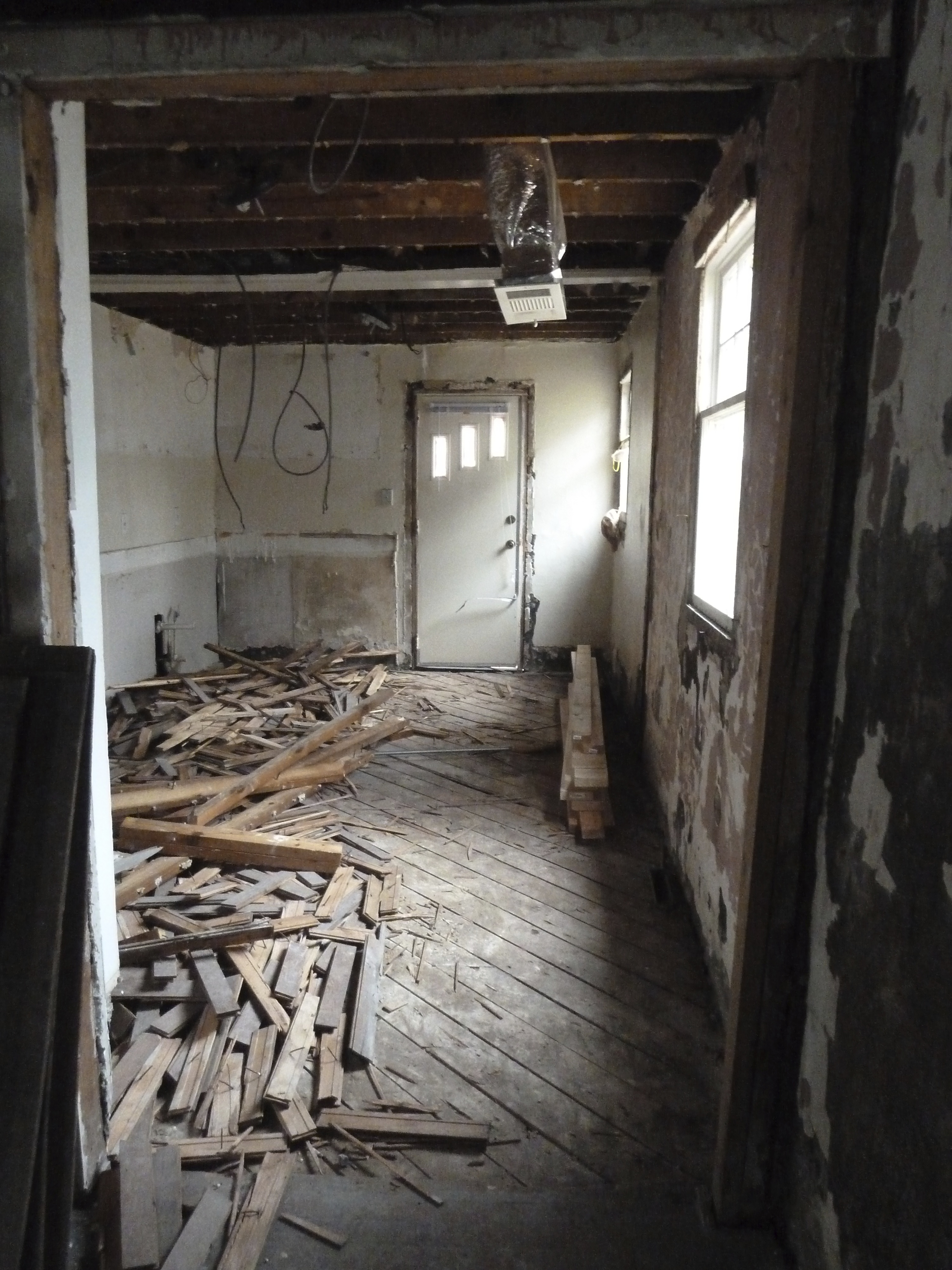 Here’s the kitchen as of this afternoon. The ceiling beam is where they had combined two rooms at some point. I’m guessing these were the original kitchen and dining room. We are going to scrap about half of the floor and use the other half to patch sections around the house.