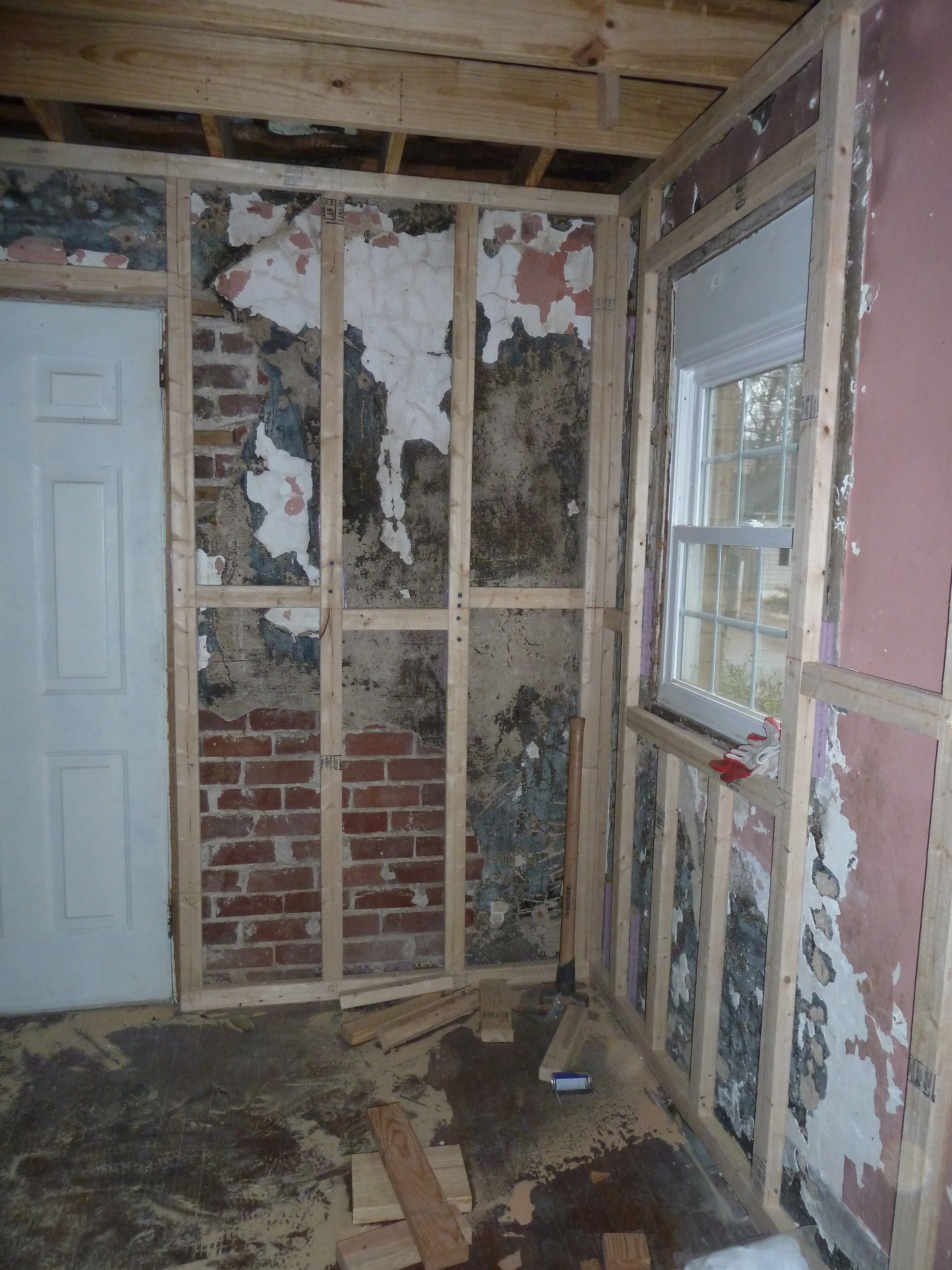 Many of the exterior walls, like the ones in the living room by the front door, are particularly challenging to insulate because much of the original plaster has fallen to expose the brick structure underneath.