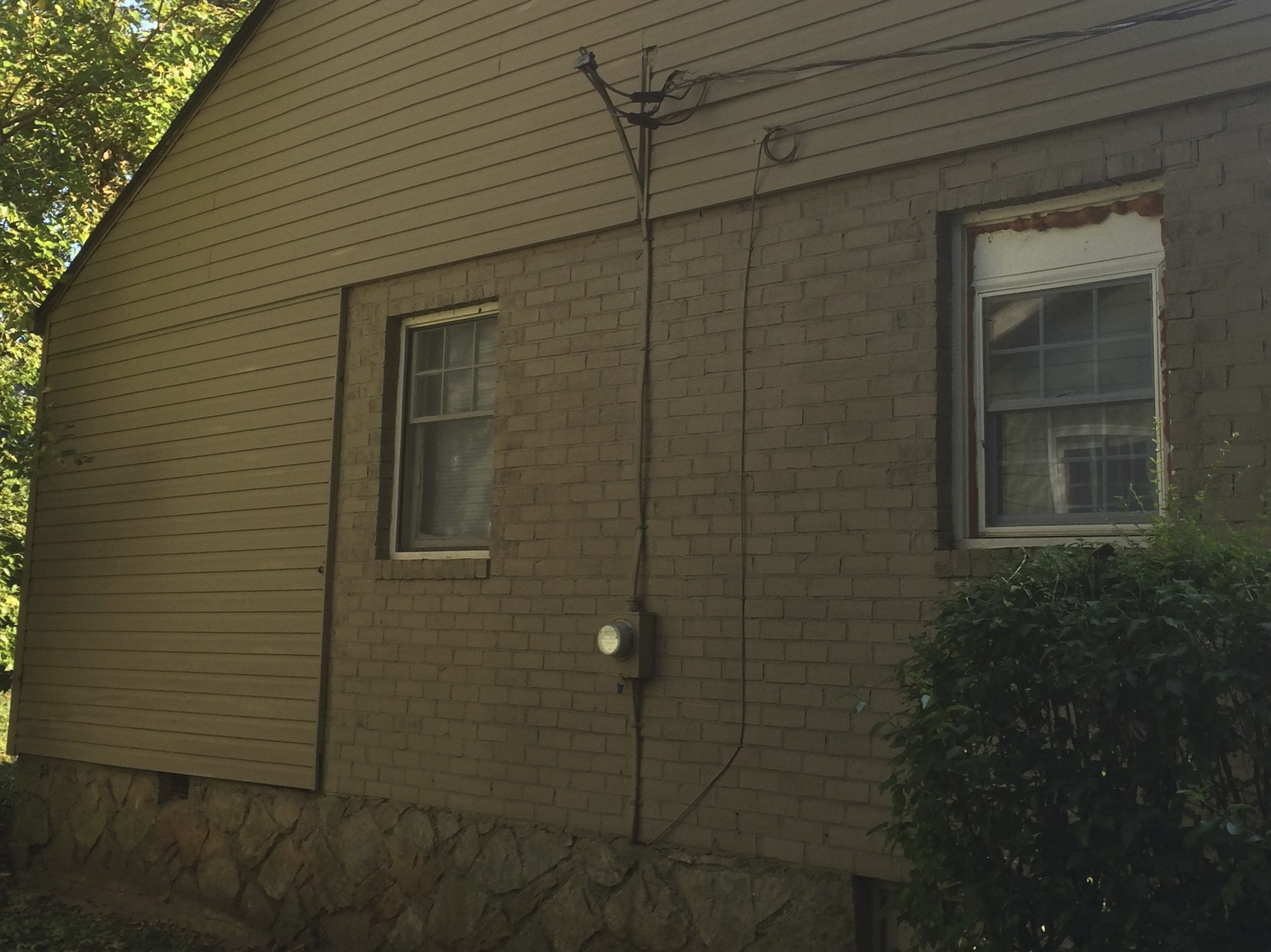 Figure 2. Exterior view of original bathroom wall. It’s hard to tell, but the vinyl siding is warped and sagging in places.