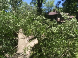 - The surviving half of the trunk looming over the neighbors’ yard.
